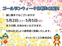 令和8年5月2日(土)~令和8年5月5日(火)の4日間、ゴールデンウィーク休暇とさせていただきます。
